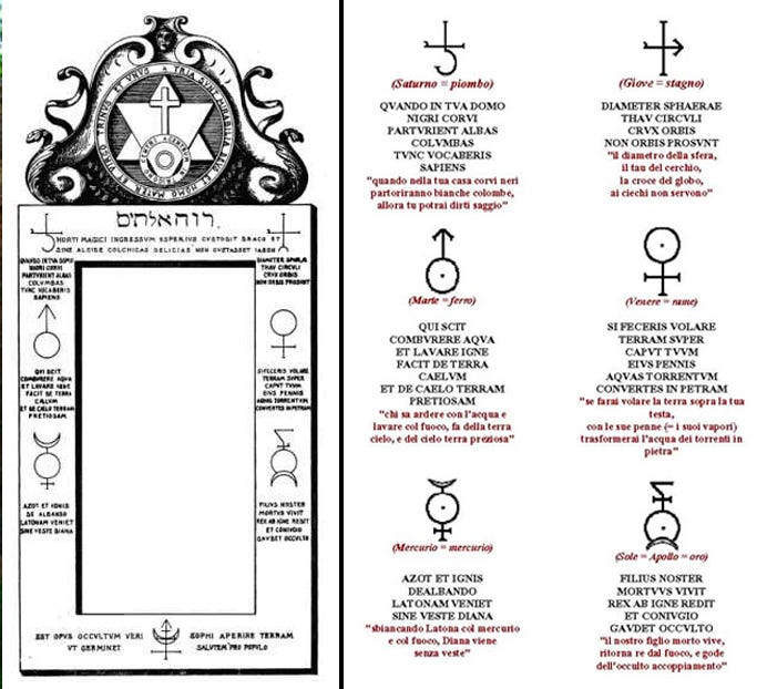 According to author and bibliophile Francesco Cancellieri: on a stormy night in 1680, a guest at Palombara’s villa, the young alchemist Giuseppe Francesco Borri from Milano, ventured into the garden searching for a particular herb he believed would enable him to produce gold. The next morning, the young doctor had disappeared, but left behind a few flakes of gold and some obscure texts. The Marquis was convinced that Borri’s puzzling symbols and equations held the secret for producing the world’s most precious metal. He engraved the “magic recipe” around his door, hoping one day it could be deciphered.