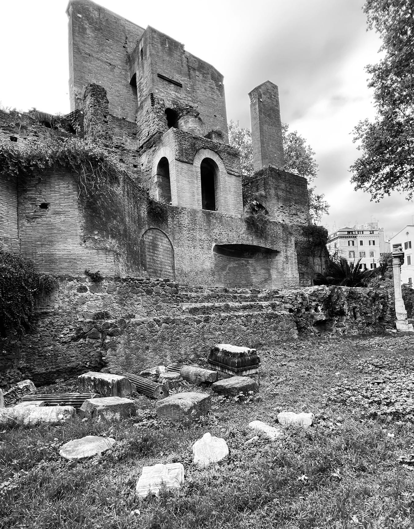 “It’s right there,” she said, pointing through the iron fence that encircled the garden. I saw an imposing Roman ruin that looked like a massive grotto, greenery sprouting up through its crevices.